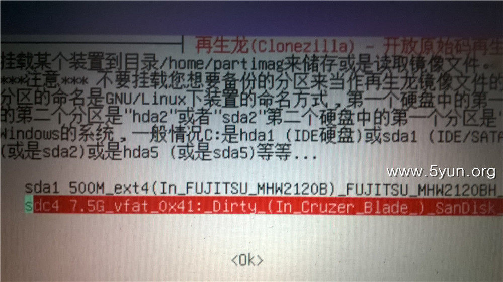 它问备份镜像放在哪里?我放在了u盘中所以选择第二个,看体积7.5G sandisk很容易判断这个就是u盘;