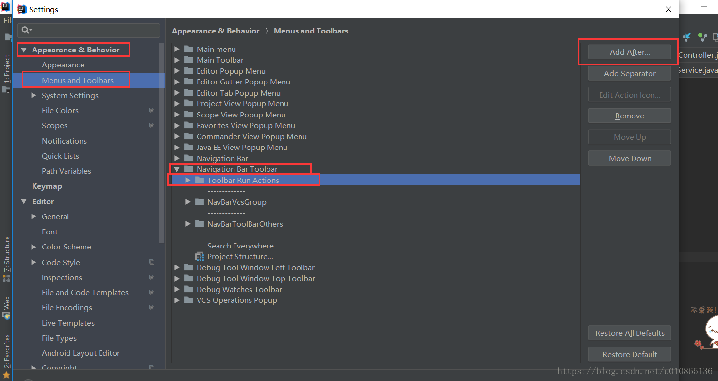 ① 按照图一选中Toolbar Run Actions ,点击右上角的 add after
