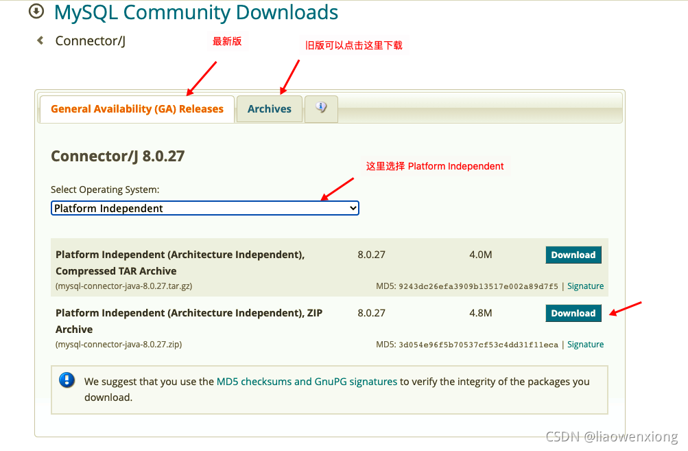 4.点击 General Availability(GA) Releases,在 Select Operating System 下拉列表选择 Platform Independent,然后选择任意一种压缩包格式后面的 Download