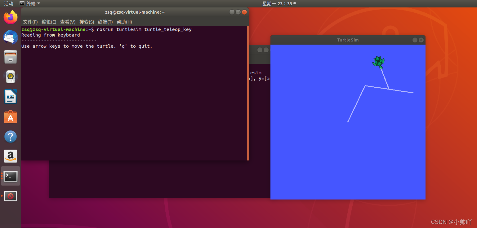 2.打开第二个终端,也可以利用 Ctrl+Shift+T 快捷键打开一个新的终端,运行如下命令,这时你会看见一只静止的小海龟