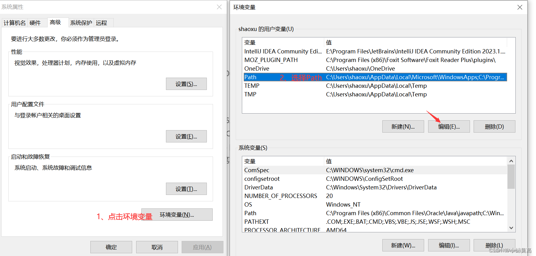 4.点击环境变量,并选择path点击编辑,将之前安装的Erlang的bin目录路径配置到path中