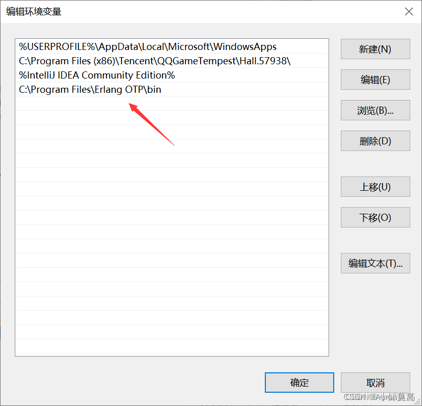 5.例如Erlang的bin目录为C:\Program Files\Erlang OTP\bin,将其配置至用户变量中即可(也可向JAVA_HOME声明一个根目录变量也可,但需加至path中)