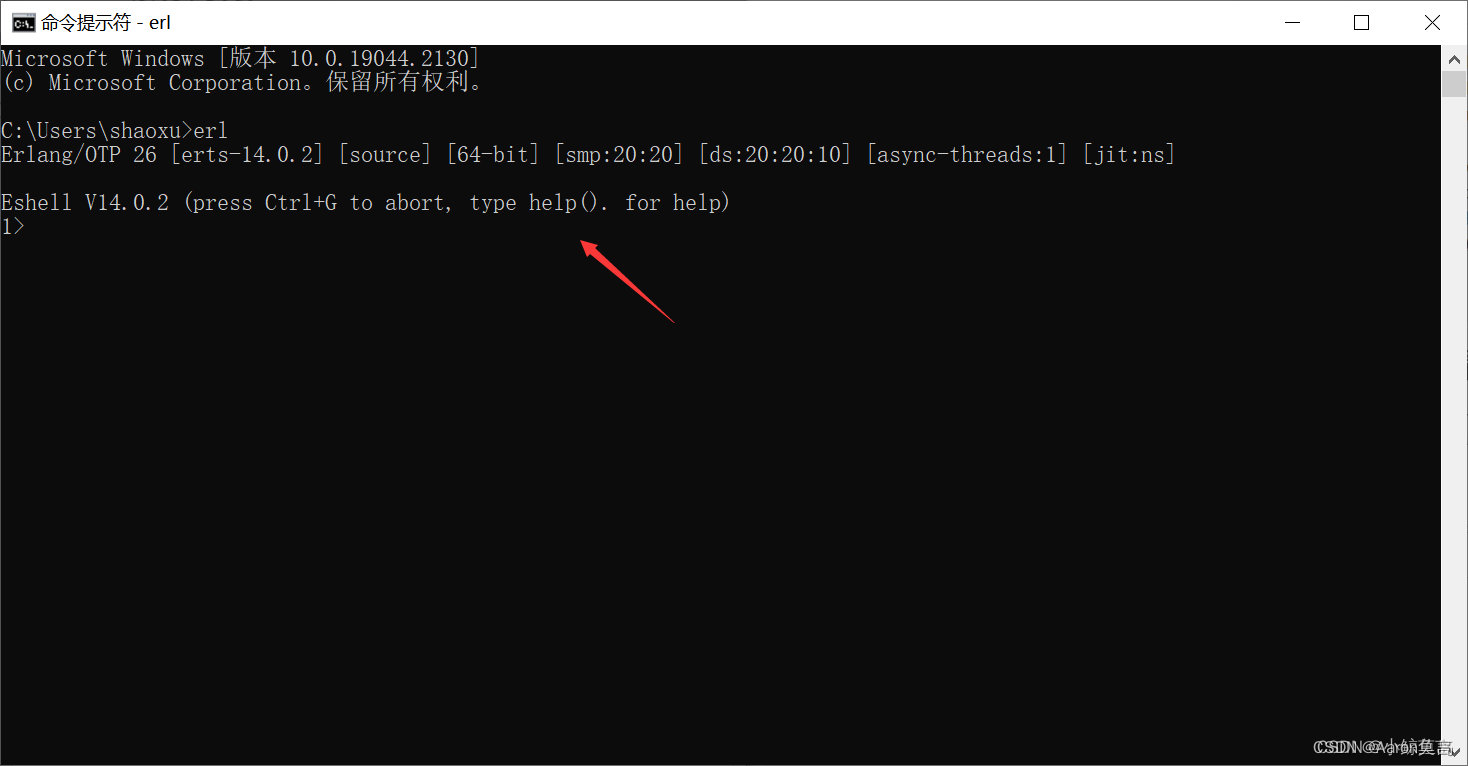 6.点击确定并保存,win+R输入cmd,打开命令窗口,输入erl出现如下所示则证明环境变量配置生效。