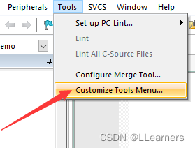 - 打开 keil(MDK) ,选择 Tools->Customize Tools Menu