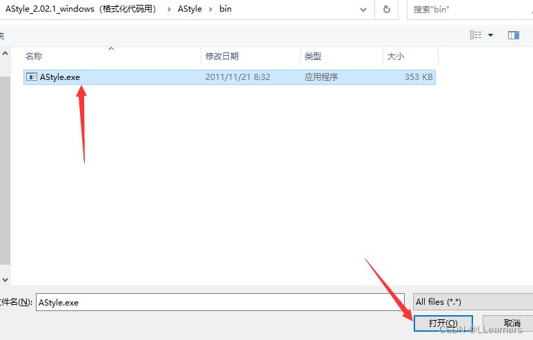 - 第1步点击1位置,第2步点击2位置选择存放路径下的Astyle.exe